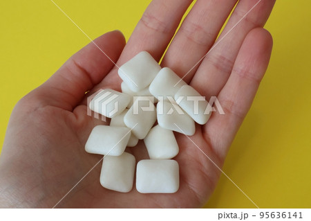 White chewing gum on a yellow background in a female hand. Lots of chew pads