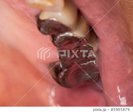 Metal crowns on the teeth in the mouth of a woman. Old harmful crowns causing allergies and diseases, macro