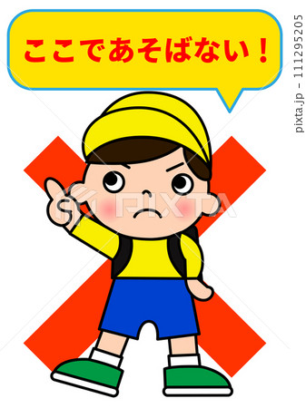 ここで遊ばないでと警告をして指さしをする小学生の男の子と吹き出し