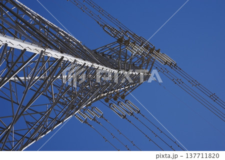 青空にそびえ立つ送電鉄塔