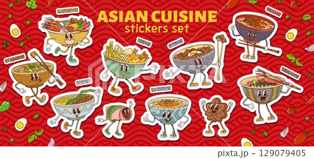 Retro groovy Asian cuisine characters stickers pack. Vector Japanese rice bowls and dishes like gyudon, unadon, tekadon, katsudon or oyakodon, soboro, taiyaki and sweets with expressive cartoon faces