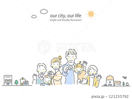 笑顔の三世代ファミリーのフレーム シンプルでお洒落な線画イラスト