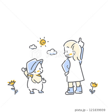 明るい未来を指差す赤ちゃんと女の子 シンプルでカワイイ線画イラスト