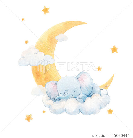 Beautiful childish watercolor hand drawn illustration with cute sleeping baby elephant. Kid's clipart print. Stock baby illustration.