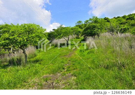 夏の丹沢山地 草地を歩く高指山への登山道 東海自然歩道