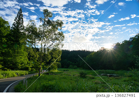 爽やかな夏空と朝日に照らされた新潟県たきがしら湿原の風景