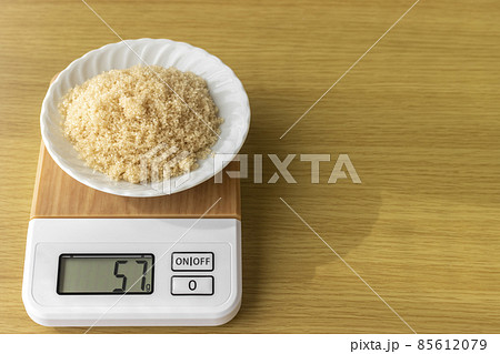 デジタルキッチンスケールで茶色い砂糖(粗糖)を量るイメージ