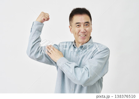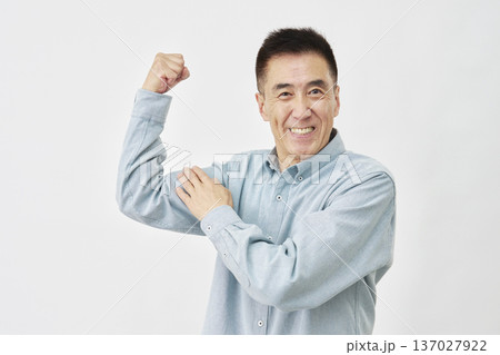白背景で力こぶのジェスチャーの男性