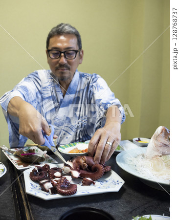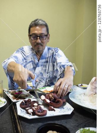 旅館で食事する男性