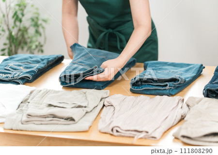 洋服をたたむ若い女性