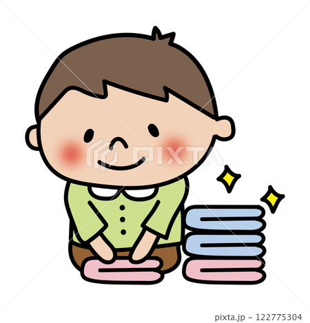 洗濯物をたたむお手伝いをする子供(男の子)
