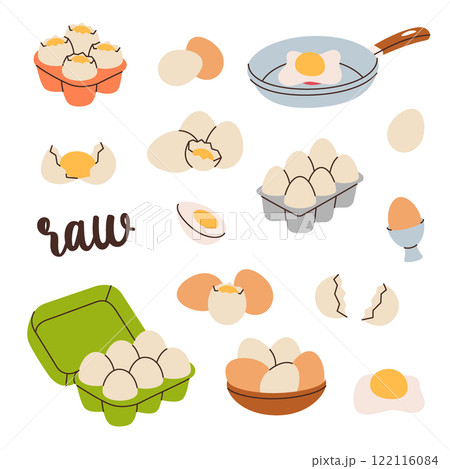 Chicken eggs set. Raw and boiled eggs, broken eggshells, protein and yolk. Hand drawn elements for cafe menu, restaurants. Vector illustration.
