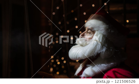 Hand holding a small Santa gnome figurine in front of a decorated Christmas tree with a golden star. Concept of cozy holiday tradition and festive home atmosphere