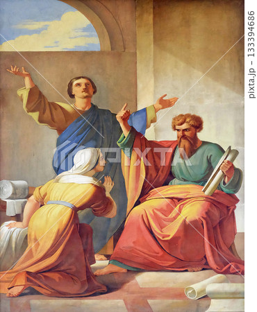The fresco with the image of the life of St. Paul: Paul at the Home of Aquila and Priscilla, basilica of Saint Paul Outside the Walls, Rome, Italy
