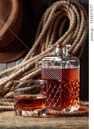 Freeze Motion of Pouring Whiskey into Glass with Ice.