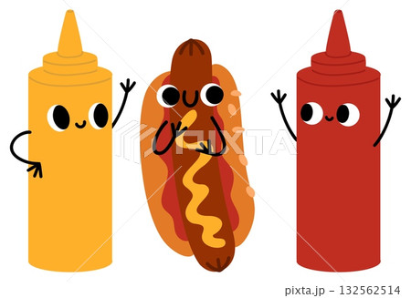 Cute cartoon hot dogs, ketchup and mustard. Stylized as fun food characters. Sauce bottle with eyes and hands. Happy burger. Chili seasoning. Smiling face. Vector fastfood mascots set