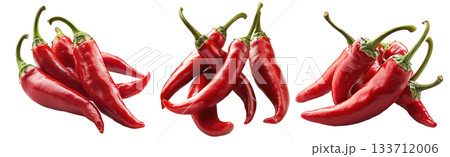White chili peppers with green stems isolated on a white transparent background. Spicy food and cooking ingredient concept
