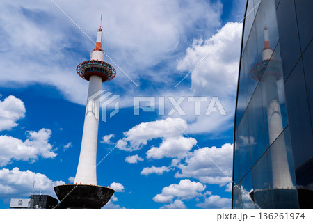京都駅烏丸中央口に大きく聳え立つ京都の観光スポット京都タワー京都市内では最も高い建造物。快晴の青空