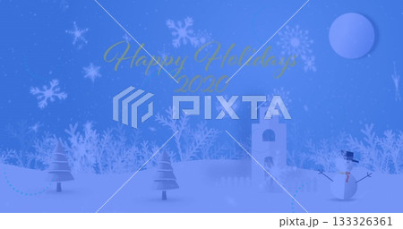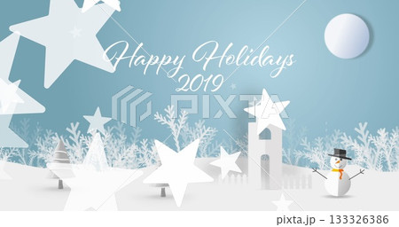 Floating white cursive greeting text Happy Holidays 2019 over snowy hills, with snowman and tower
