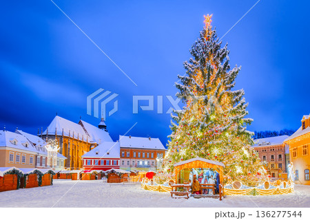 Brasov, Romania. Snowy winter holiday landscape with Christmas Market, Transylvania