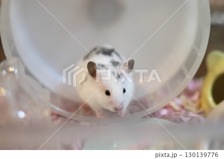 餌を食べるゴールデンハムスター(ダルメシアン)