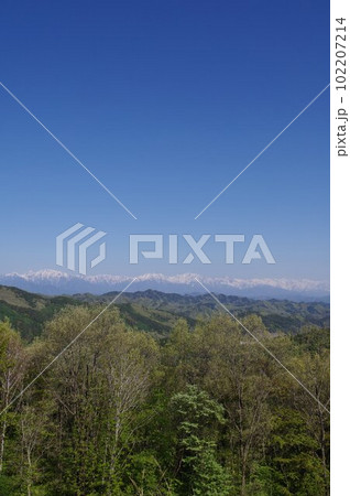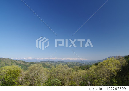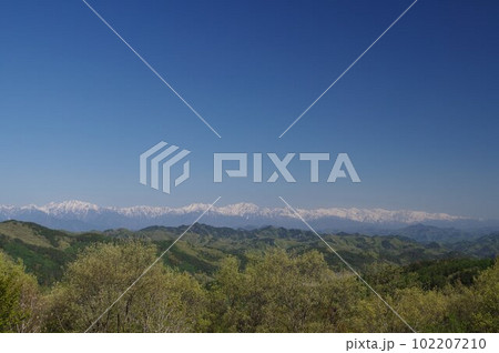 信州安曇野 筑北村北アルプスパノラマ展望台からの北アルプスの眺望(春)