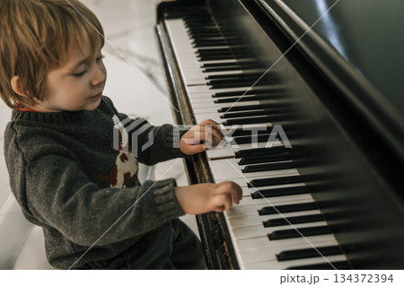 Little Boy Learning to Play Grand Piano. Early Childhood Music Education