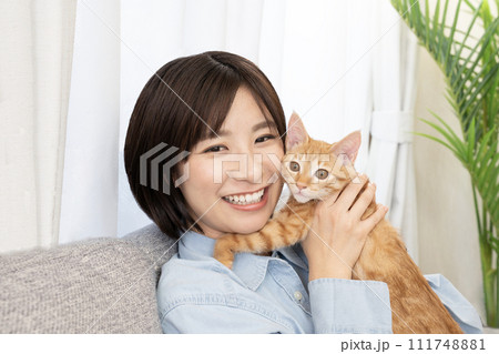 仔猫と頬を寄せて微笑む女性