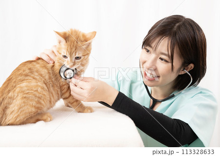 ちゃとらの仔猫と女性獣医師