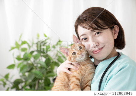 茶トラの仔猫を抱く女性獣医師