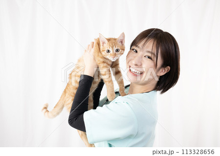 ちゃとらの仔猫を抱く女性獣医師