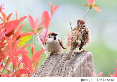 2羽の仲良しスズメ オスとメス (オス・メスはイメージ))
