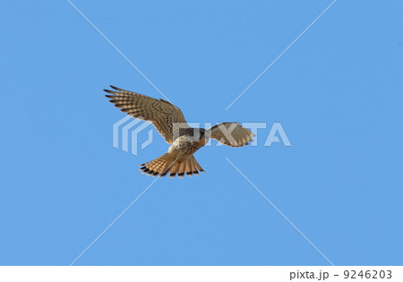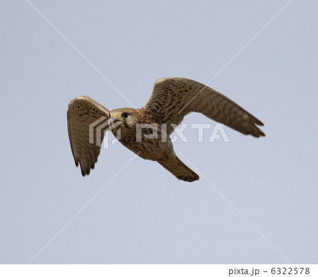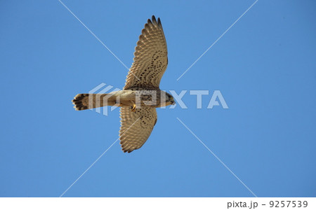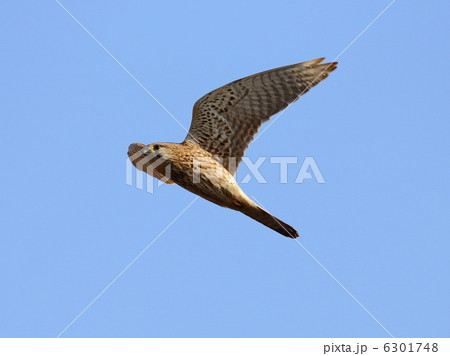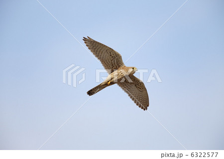 青空を背景に獲物を探して飛翔しているチョウゲンボウ