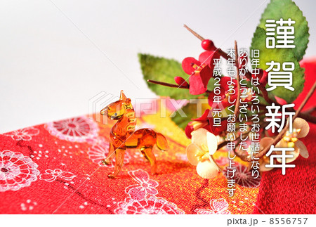 ちりめん細工の白馬とカラフルなペーパーフラワーの年賀状背景