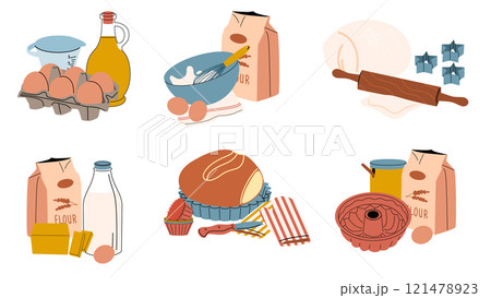 A set of baking tools and ingredients. Kitchen utensils and kitchenware.