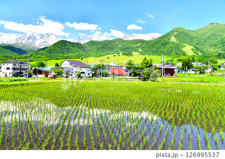 広大なゲレンデから望む北アルプス白馬連峰の絶景パノラマ (長野県、白馬、栂池高原)