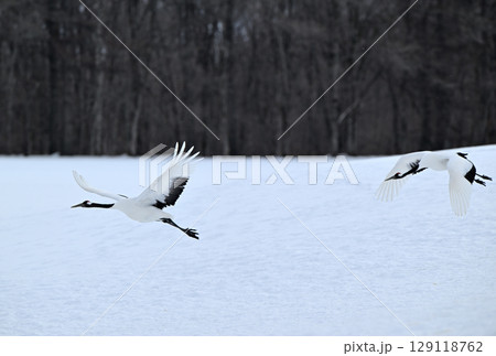 北海道鶴居村の給餌場から飛び立つタンチョウの群れ