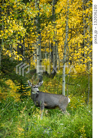 Young mule deer in green bush under yellow aspen grove in autumn season