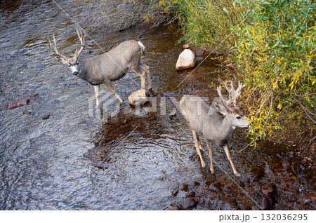 Two mule deer buck with impressive antlers crossing the creek.