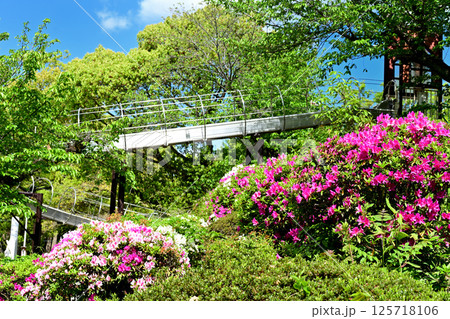 淡輪遊園(あたご山公園)のツツジ群落/朱塗りのレトロな橋(上側 :京橋 / 下側 : 松寿橋)