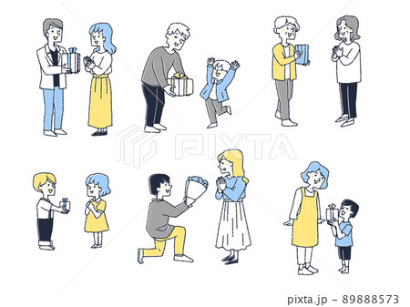 恋人(妻)にプレゼントを渡す男性 コミカルな手書きの人物 ベクター、温かみのある線画