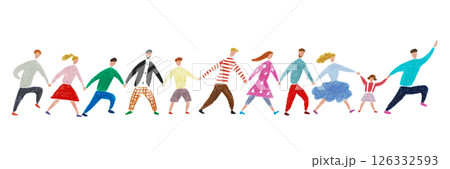 手描きイラスト 横に並んで手をつなぐ人々