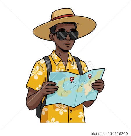 Young man traveler with sunglasses and hat holding travel map vector illustration