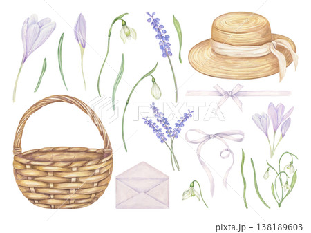 Watercolor spring floral elements clip art on isolated background. White snowdrops, crocuses, grape hyacinth, envelope, woven basket, hat set. Flowers and picnic accessories for greeting card
