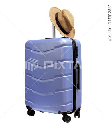 Angled view, large wheeled suitcase with sun hat on top for sea beach resort and vacation. Closed