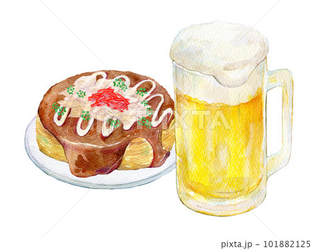 お好み焼きとビールのセット 水彩イラスト