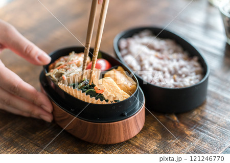 キッチンでお弁当を詰める女性の手元(愛妻弁当)