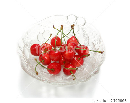 ガラスの器に盛られた日本のサクランボ、白背景。