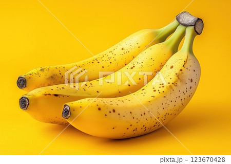 A bunch of ripe bananas with natural brown speckles on a yellow background