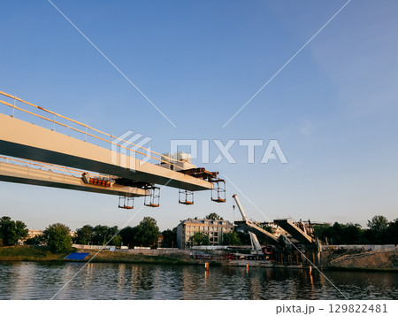 Construction workers raising prefabricated bridge segments using large cranes near Vistula River in Krakow, Poland, highlighting urban infrastructure progress and engineering complexity. Construction